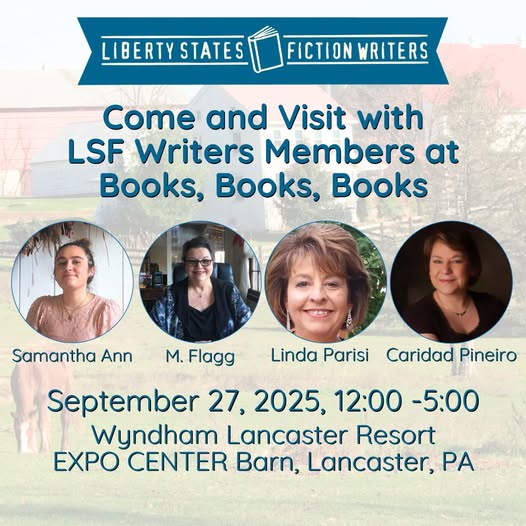 Meet award-winning and bestselling LSF Writers Members Samantha Ann, M. Flagg, Linda Parisi, and Caridad Pineiro at Books, Books, Books, in Lancaster, PA. Come and say hello, check out their fabulous books, pick up some swag, and cool charms at the Wyndham Lancaster Resort Expo Center Barn on Saturday, September 27, from 12:00 to 5:00.