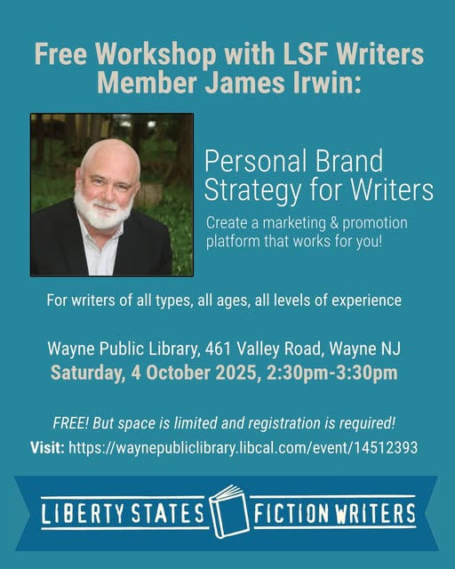 On Saturday, 4 October, join LSF Writers Member James Irwin for the workshop “Personal Brand Strategy for Writers.” James will talk about how to create a marketing and promotion platform that suits your time and resources, and helps you achieve your goals. The workshop will be held at the Wayne Public Library, 461 Valley Road in Wayne, NJ, at 2:30 pm. The workshop is free, but space is limited and registration is required. To register go to https://waynepubliclibrary.libcal.com/event/14512393.